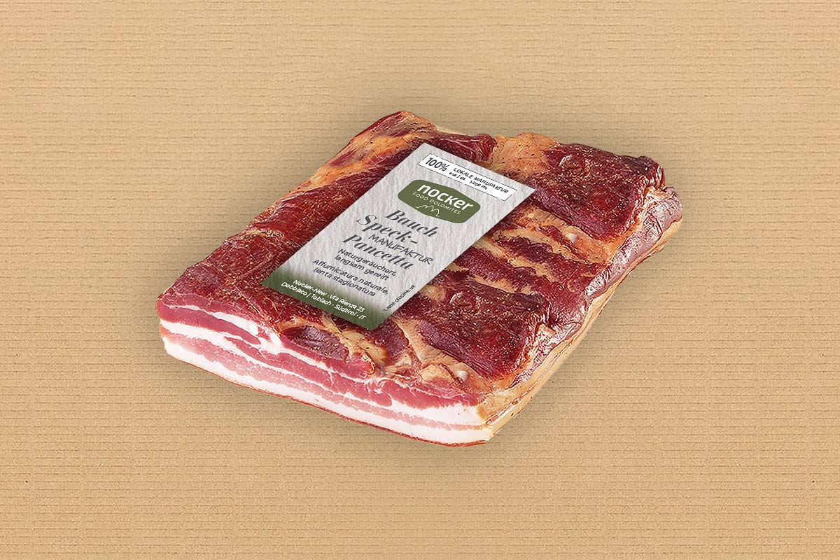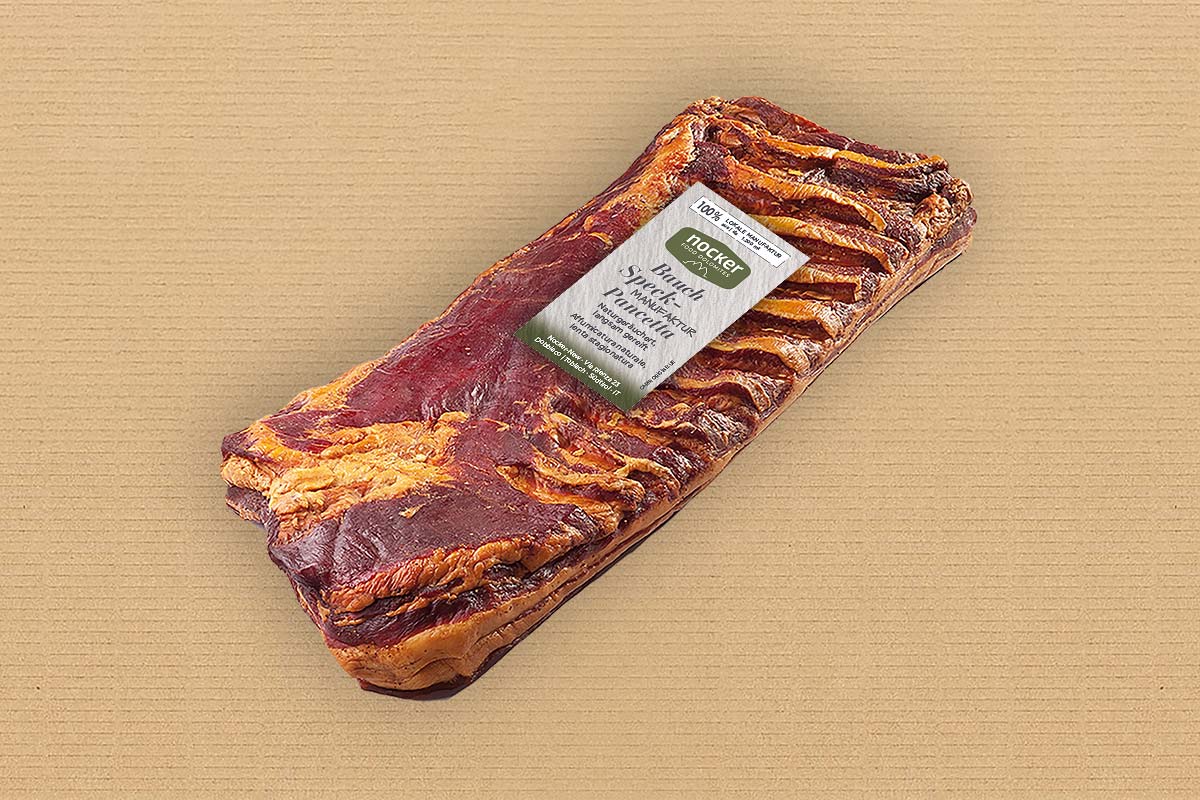 Entfernen Sie die Plastikfolie des verpackten Speckstücks und lassen Sie den Speck eine Stunde atmen, damit er das ideale Aroma entfalten kann.